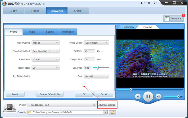 Click Advanced Settings button to go to set all video parameters and audio parameters if you like.