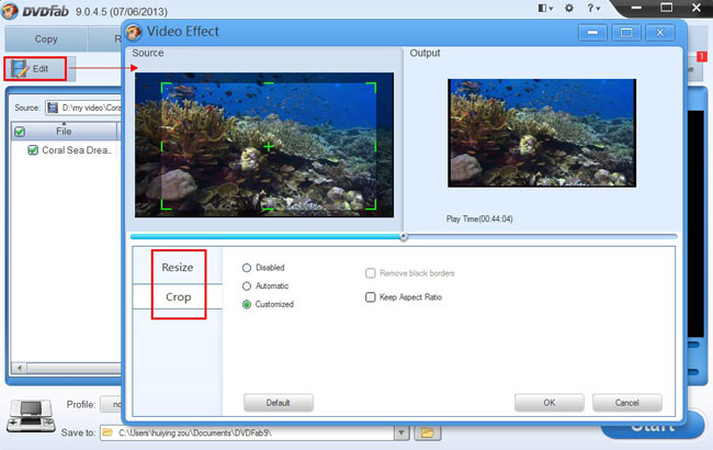 And hit Edit button to go to Video Effect window. You can resize the source aspect ratio and frame resolution of the video here, or crop the image for display.
