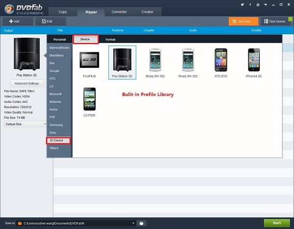 Convert 3D Blu-ray to Glasses-Free 3D Videos > Step 3: Click the Profile Box (or Profile Icon) which takes you to DVDFab Built-in Profile Library, and then select one profile from the “3D Device” column that matches your smartphone, such as “3D.LG.P920.h264.aac”;